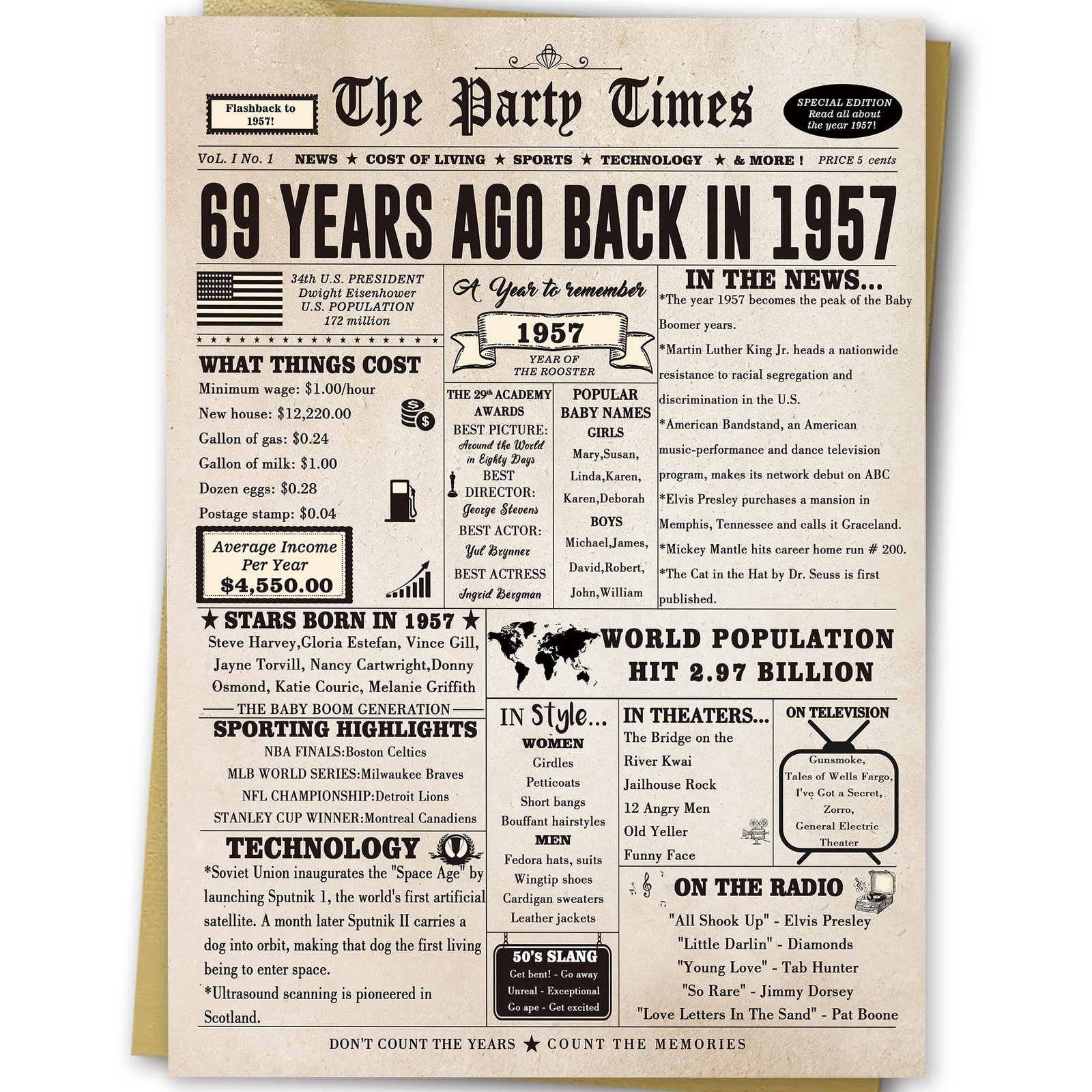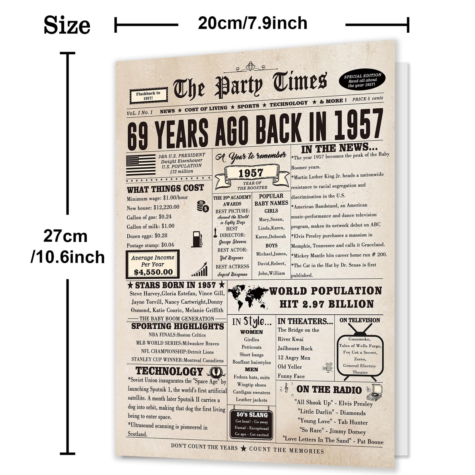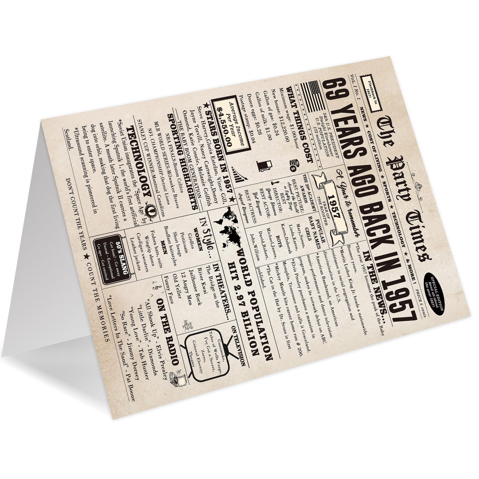 • This large 69th birthday card features a vintage newspaper design, showcasing important events, movies and sports events from 69 years ago
